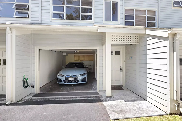 室内からアクセス可能な1台用ガレージと追加収納スペースを備えたタンデム式駐車場があり、