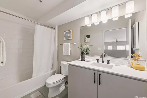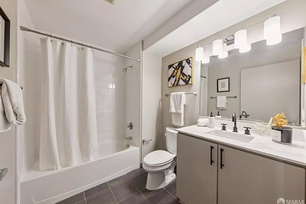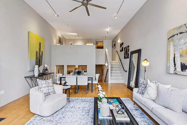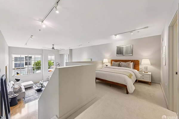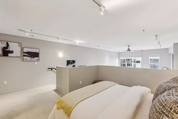 この1ベッドルーム・2バスルームの住居は、ロフト形式の寝室スペースを備えており、